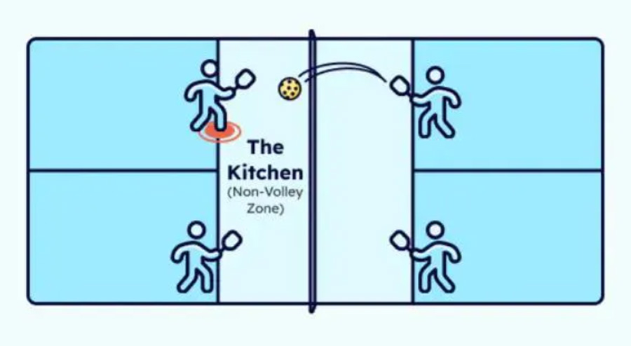 Khu vực “kitchen” là một vùng cấm gần lưới, rộng khoảng 2.1m tính từ lưới ra hai bên sân. Luật pickleball cấm người chơi đánh bóng bay trong khu vực này, buộc các vận động viên phải sử dụng chiến thuật đánh bóng ngắn hoặc xử lý bóng từ xa. Điều này không chỉ làm tăng sự thú vị của trò chơi mà còn giảm nguy cơ chấn thương cho người chơi, giúp bảo vệ sức khỏe trong suốt trận đấu.